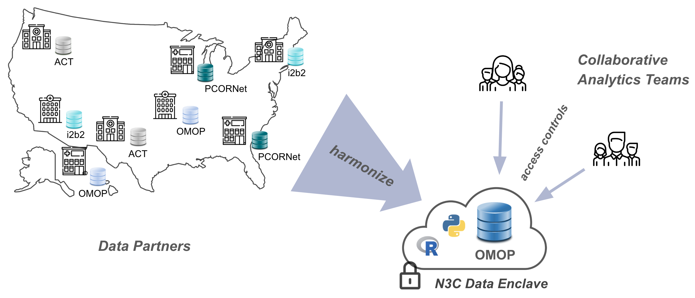 Faced with the COVID-19 pandemic, the issue addressed by N3C is clear and direct: the US has no centralized data repository for health records and related information, hindering the response of the scientific community.1 Although healthcare providers are mandated by law to utilize electronic health records (EHR), little guidance coordinates how or exactly what information to collect and store. Commercial data-collection suites (e.g., Epic) are widely used in clinical settings, and controlled vocabularies (e.g., ICD10 and SNOMED) provide standards for representing medical information, but there are many such standards in use and software is highly configurable to the needs of individual organizations. As a result, databases of EHR information across the US are largely non-interoperable, presenting challenges to researchers hoping to use this vast national store of information in practice.