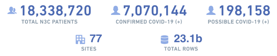 Because effective analysis of EHR data requires a diverse set of skills-especially clinical and data science/statistical expertise-N3C provides organizational structures and resources to rapidly create and support multidisciplinary research teams, many of which are geographically diverse as well. As of February 2023, dozens of these “Domain Teams” have supported over 400 research projects, contributed to by over 3,300 researchers hailing from 350+ different institutions and organizations. Over seventy data partners provide EHR data for 17 million patients (a third of whom have had COVID-19), representing 10.5 billion lab results, 3.5 billion medication records, 2 billion clinical observations, and 1 billion clinical visits. For up-to-date information on these numbers and more, visit our dashboard at https://covid.cd2h.org/dashboard.