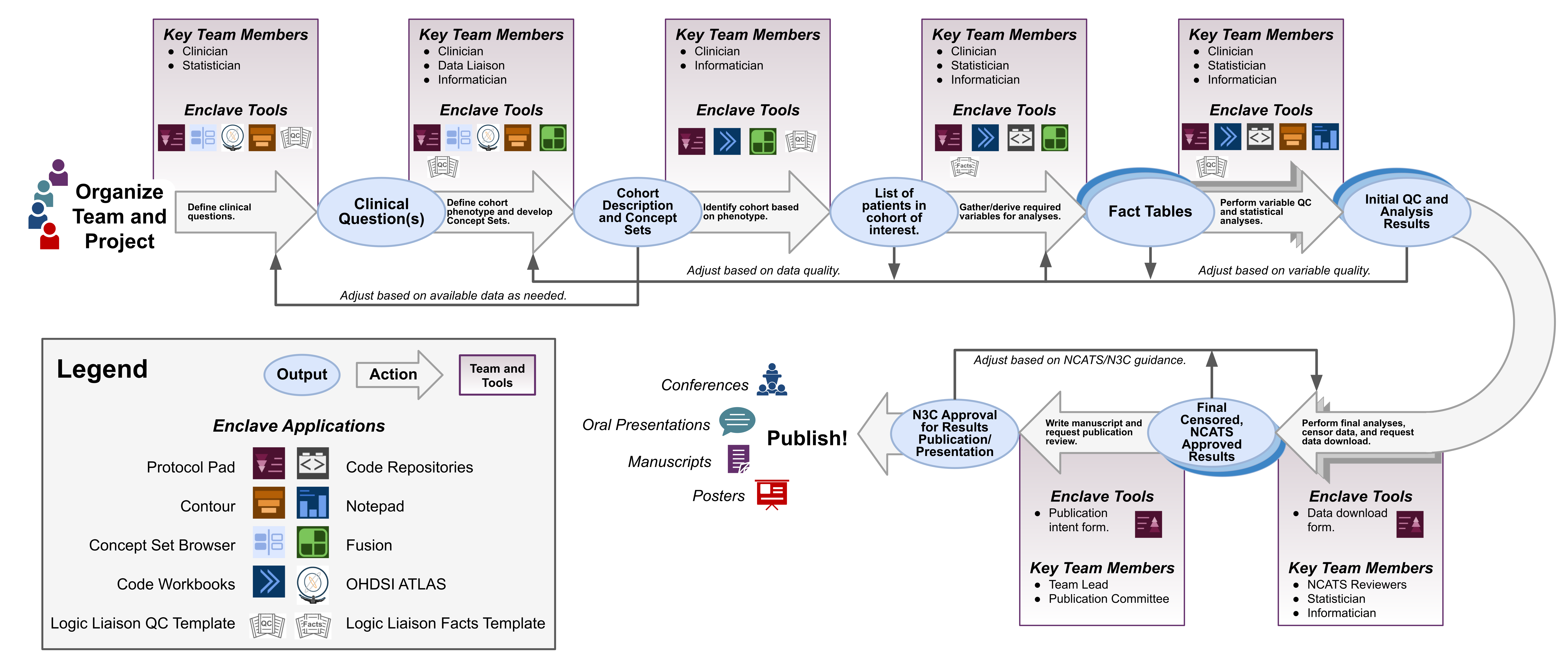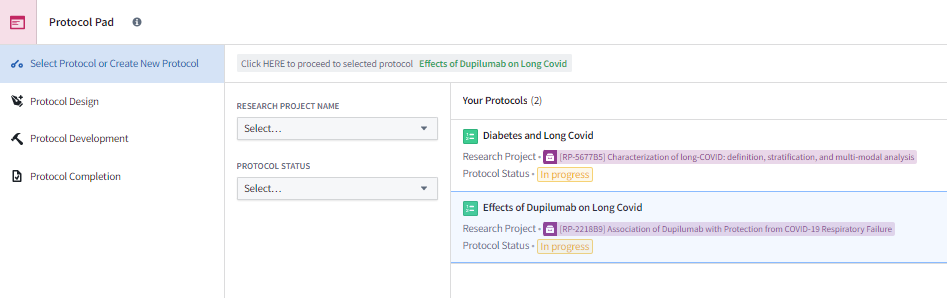 Protocol Pad is the foundation for performing reproducible and repeatable science within the Enclave. The templates, checklists, and links to key resources provided within the tool guide you along the path of a well-structured division of labor and use of best practices when performing research using the observational data in the Enclave. The tool also assists your team in keeping the work in alignment with the project. A more in-depth explanation of how Protocol Pad can facilitate research will be available in the future. Documentation on the tool’s functionality can be found in the QuickStart Users’ Guide to Protocol Pad as well as the Protocol Pad White Paper and Detailed Instructions .
