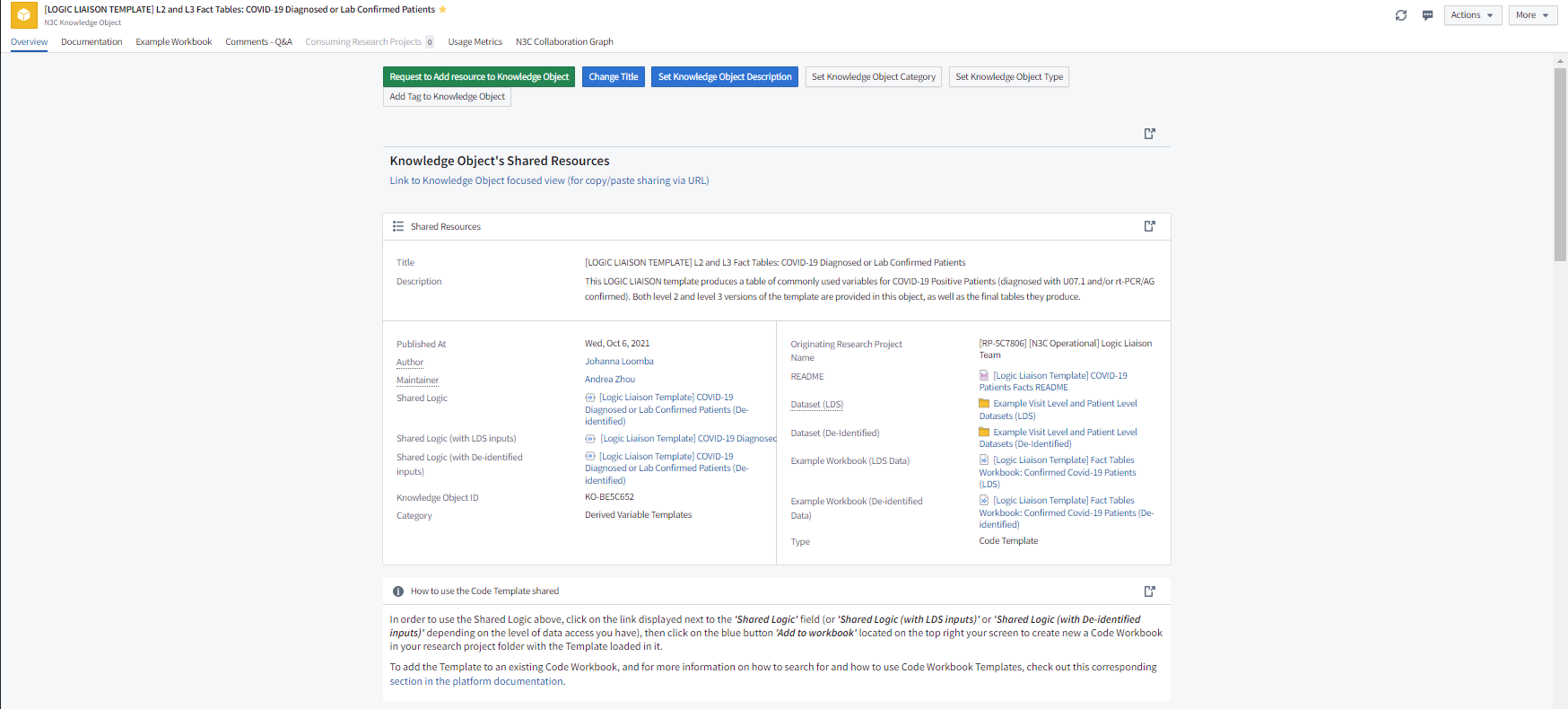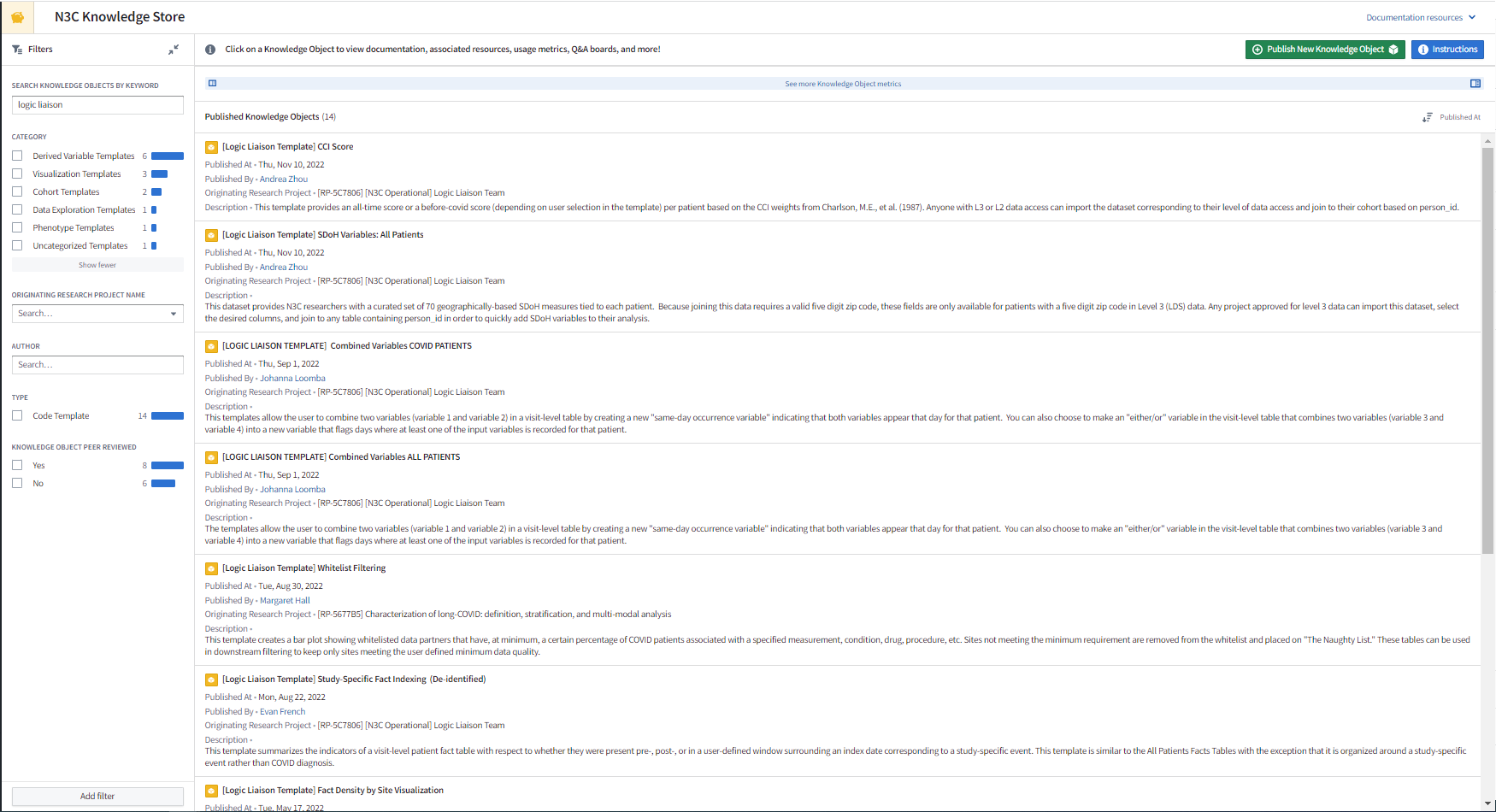 The N3C Knowledge Store is an application where you, as an N3C Data Enclave user, can discover shared code templates, external datasets, reports, cohorts, and Python libraries (collectively also known as Knowledge Objects or KOs) and share similarly re-usable Knowledge Objects of your own with other Enclave users, regardless of the specific project from which the resource originated. Most Knowledge Store (KS) objects come about as core contributors and researchers alike develop resources they believe may be useful for others either within or outside of their research project team and wish to share them with the broader community. If you find yourself in this situation, you can easily create, submit, and share a KS resource by following this Code Workbook Template Quick Start Guide . Otherwise, more specifics on how to navigate the KS can be found in this Knowledge Store Guide within the Enclave.