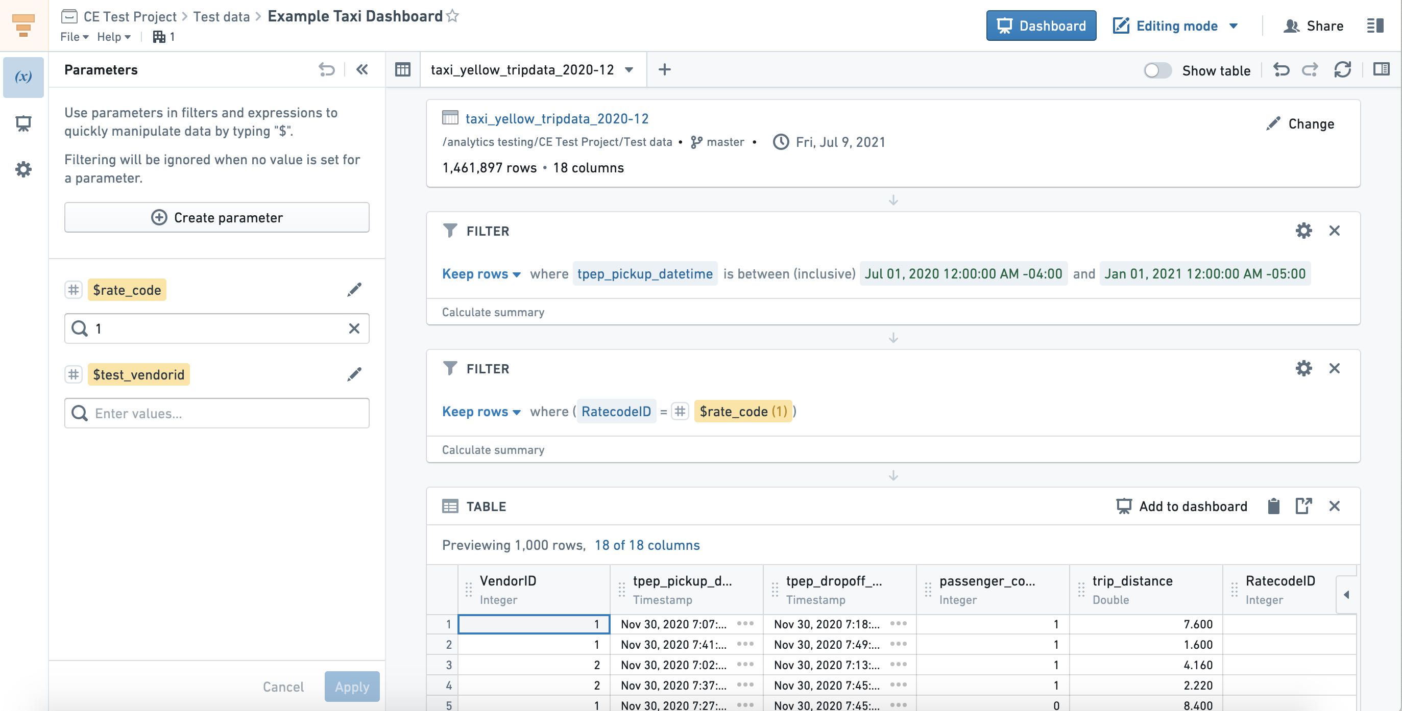 The Contour application is a programming-free interface to the Enclave that allows those with limited knowledge of Python, R, and SQL to create top-down analysis pipelines in a point-and-click fashion, as well as generate dynamically updated dashboards. A Contour analysis starts by specifying the path to the input dataset as shown in Figure 8.9. Subsequent transforms of that dataset are then specified, which can include adding/calculating new columns, filtering rows or columns, joining with other datasets, creating summary figures and charts, summarizing tables through pivoting, and more. Contour’s expression language also allows for more complex querying and data aggregation beyond the default operations provided. Once an analysis is complete, resulting datasets can be saved to the Enclave for use in additional Contour pipelines or other Enclave applications, like Code Workbooks. Contour can also quickly create summary figures from source tables without code, and has a variety of visualization options, including bar charts, histograms, and heatmaps.