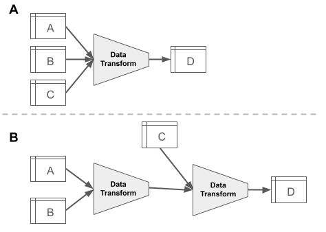 Code Workbook is a GUI-based application for you to apply code-based transformations to datasets for the purpose of creating new datasets and visualizations. The explicit goals of the application are to facilitate a collaborative environment in which you can quickly iterate over logic to produce artifacts interoperable with the suite of Enclave applications. The default Code Workbook interface is structured as a directed graph in which nodes represent either datasets or transformations that output datasets. Edges represent the flow of data through the graph such that upstream datasets are inputs for logical operations performed by downstream code transforms. Figure 8.10 shows an abstract version of a Code Workbook, while Figure 8.11 is an actual screenshot in the Enclave where data flows from the left to the right. Any dataset which you have access to within the workspace where the Code Workbook is located can be imported as an input to the various types of transformations. For each transformation one or more tables are specified as the input and are transformed into a single output table (Figure 8.10). Multiple transformations can also be strung together (Figure 8.11) to create an analysis pipeline (see Foundry’s Anatomy of a Data Pipeline module for more detailed information, as well as Chapter 9). In Code Workbook, the primary and required output of a transformation is always a single table; however, visualizations such as graphs and charts can also be generated and saved along the way. Note that the code performing the transformation and the resulting output table are always represented as a single node in the Code Workbook interface.
