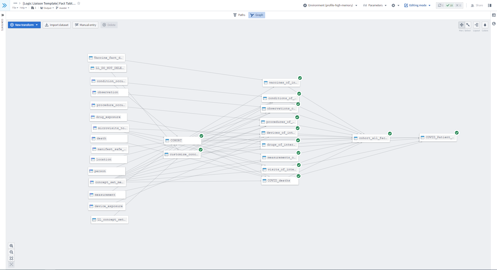 Informaticians and data scientists then utilize the computational phenotype and vetted concept sets to generate fact tables (i.e., datasets containing information about each patient like demographics, comorbidities, lab results, etc) for the cohorts of interest using the raw OMOP tables, which requires specific knowledge of how to work with large datasets in a Spark environment. Fact tables include all the information needed to characterize a cohort and perform downstream analyses to answer your research questions. Facts can include patient demographics, socioeconomic status, COVID status/severity, medications, comorbidities, etc. Logic Liaison Fact Table Templates can provide you a boost by allowing fast and robust generation of commonly used facts using N3C-vetted concept sets and peer-reviewed code as a starter table. You can then append this base fact table to include project-specific facts needed for analyses. Figure 8.6 and Figure 8.7 in the N3C Knowledge Store section of this chapter provide a more detailed view of how Logic Liaison Templates can be integrated into a project to expedite fact table generation. The generation of the original fact tables from raw OMOP tables can be done using Code Workbooks (Section 8.4.3) or Code Repositories (Section 8.4.4).