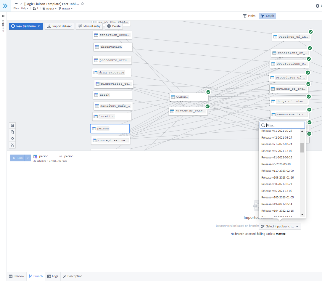 Because the master branch can change in the interval between you creating a branch and merging it back in, it is important to preview merge changes to ensure that the branch’s contributions are both correct and compatible with the current state of the master branch. However, note that your branch will be automatically deleted after it is merged, which is an important difference from the normal Git behavior. Another prime use case for code branching is to ensure the reproducibility of a given dataset used in a research project. Because the OMOP and N3C-curated datasets are also versioned, you can create a code branch in which all input datasets are set to the same version release (as shown in Figure 8.12) to effectively freeze a dataset used in a specific analysis for later reproducibility while still allowing the possibility of adding additional features. User-generated datasets are set to the same branch as the Code Workbook in which they were created. Finally, Code Workbooks allow you to collect and download all coded transformations within a single workbook into a Git repository that can be easily uploaded to GitHub for public dissemination.