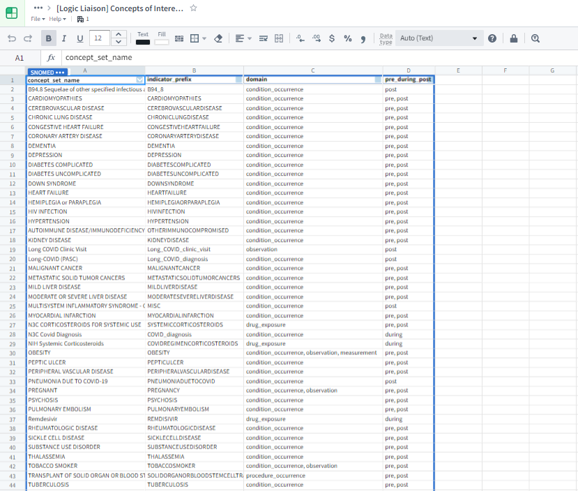 Fusion, shown in Figure 8.14, is a spreadsheet application within the Enclave analogous to Microsoft Excel or Google Sheets. Palantir provides extensive documentation. Fusion allows you to sync specific cell ranges within a spreadsheet to Spark datasets, which can subsequently be imported into any other Enclave application. Fusion is an excellent option for use cases which require manual data entry, such as curating lists of concept sets (see Chapter 7) to configure the Logic Liaison Fact Tables and Templates. Unlike many other Enclave applications, Fusion is not suitable for large datasets; each document has a maximum size of 50 MB. Similar to Google Sheets, multiple users can simultaneously view and edit the same document.