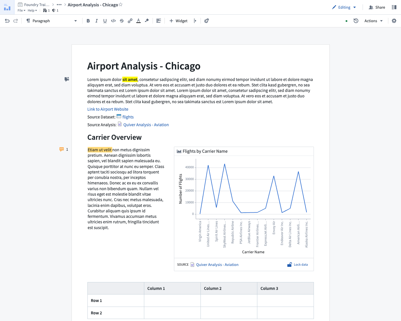 All embedded objects can be configured to remain static or refresh automatically when the underlying data sources update. Notepad is also useful for annotating documents, presenting an executive summary of results for internal stakeholders, or external presentations after being approved for download request and export as PDF. A Logic Liaison Template in the Knowledge Store generally includes a README which is created using Notepad. The tool does have limitations in that it cannot be used to create dashboards that include chart-to-chart filtering; however, a Contour Dashboard can provide this feature for tabular data and a Quiver Dashboard can provide this feature for object or time series data. Palantir has curated documentation for creating and editing Notepad documents. Palantir also has documentation for their application known as Reports that was previously used in a similar fashion though with less functionality compared to Notepad.